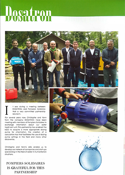 منذ عدة سنوات حتى الآن، يجتمع كريستوف ويان من شركة دوساتروناف مع أعضاء من شركة بومبير سوليديرز لتبادل المعلومات حول وحدة معالجة المياه. وقد مكّنت هذه الشراكة المنظمة غير الحكومية من الحصول على مضخة جرعات أكثر ملاءمة لمعالجة الكلور، وإنشاء أداة حسابية تسهل استخدام إعدادات مضخة الجرعات في الميدان والعديد من الاكتشافات الأخرى.