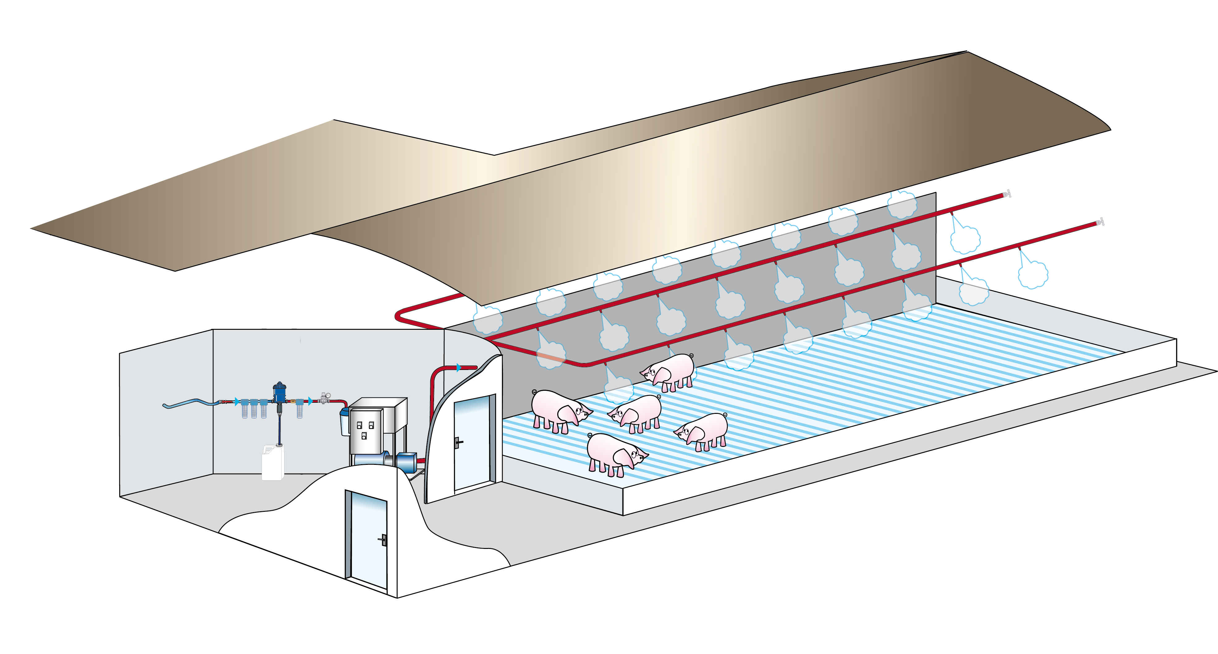 Air misting is used to cool the air, reduce dust concentration, treat odours, soak the barn before cleaning/disinfection without forgettind the air misting nozzle descaling / cleaning.