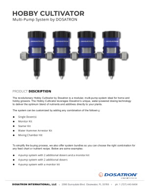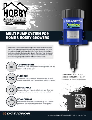 Engineered specifically for indoor home grows and basement grows, the Hobby Cultivator is perfect for applications with an average of 4 to 24 lights or 12 to 96 plants. The standard system comes with four Dosatron pumps but is easily adapted by adding more pumps based on the needs of the application. It can be used with a direct injection approach or alongside small batch tank systems and recirculating water cultures.