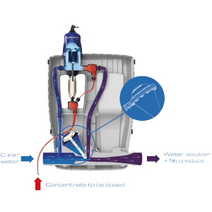 Como todas las bombas dosificadoras Dosatron, la dosificación del aditivo por el conjunto del sistema es proporcional al volumen de agua, independientemente de las variaciones de presión y caudal que puedan producirse.