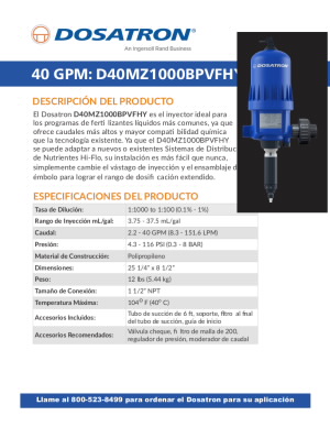 El Dosatron D40MZ1000-HY es el inyector ideal para los programas de fertilizantes líquidos más comunes, ya que ofrece caudales más altos y mayor compatibilidad química que la tecnología existente. Ya que el D40MZ1000-HY se puede adaptar a nuevos o existentes Sistemas de Distribución de Nutrientes Hi-Flo, su instalación es más fácil que nunca, simplemente cambie el vástago de inyección y el ensamblaje del émbolo para lograr el rango de dosificación extendido.