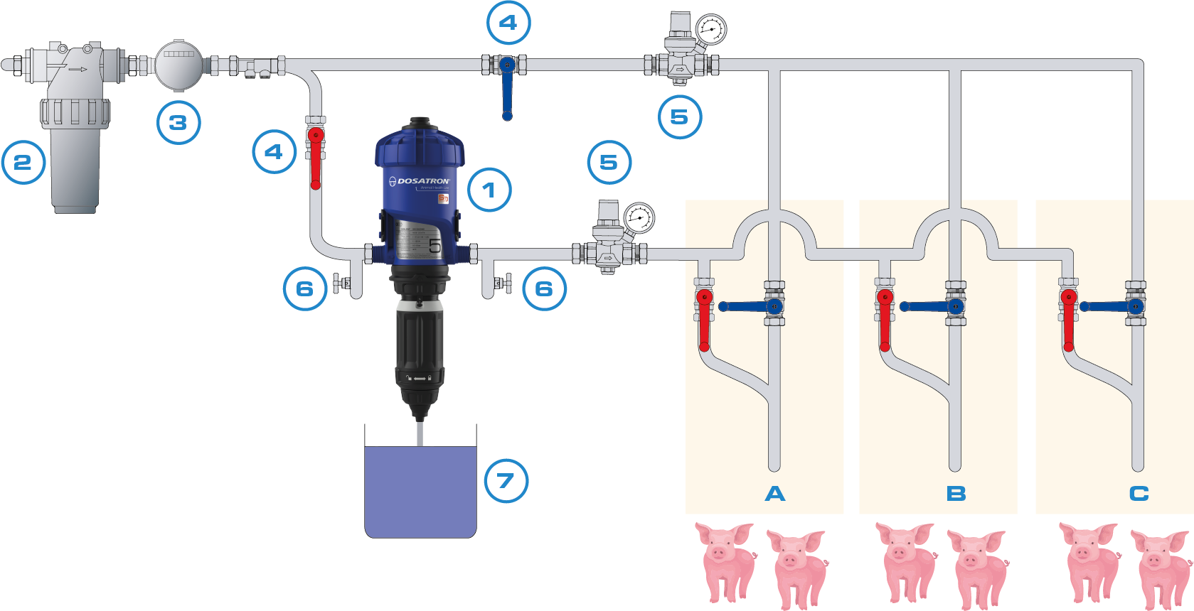 La technologie Dosatron garantit que les animaux ont un accès égal à la bonne quantité de vaccin à tout moment et que la solution vaccinale est distribuée uniformément à chaque abreuvoir.