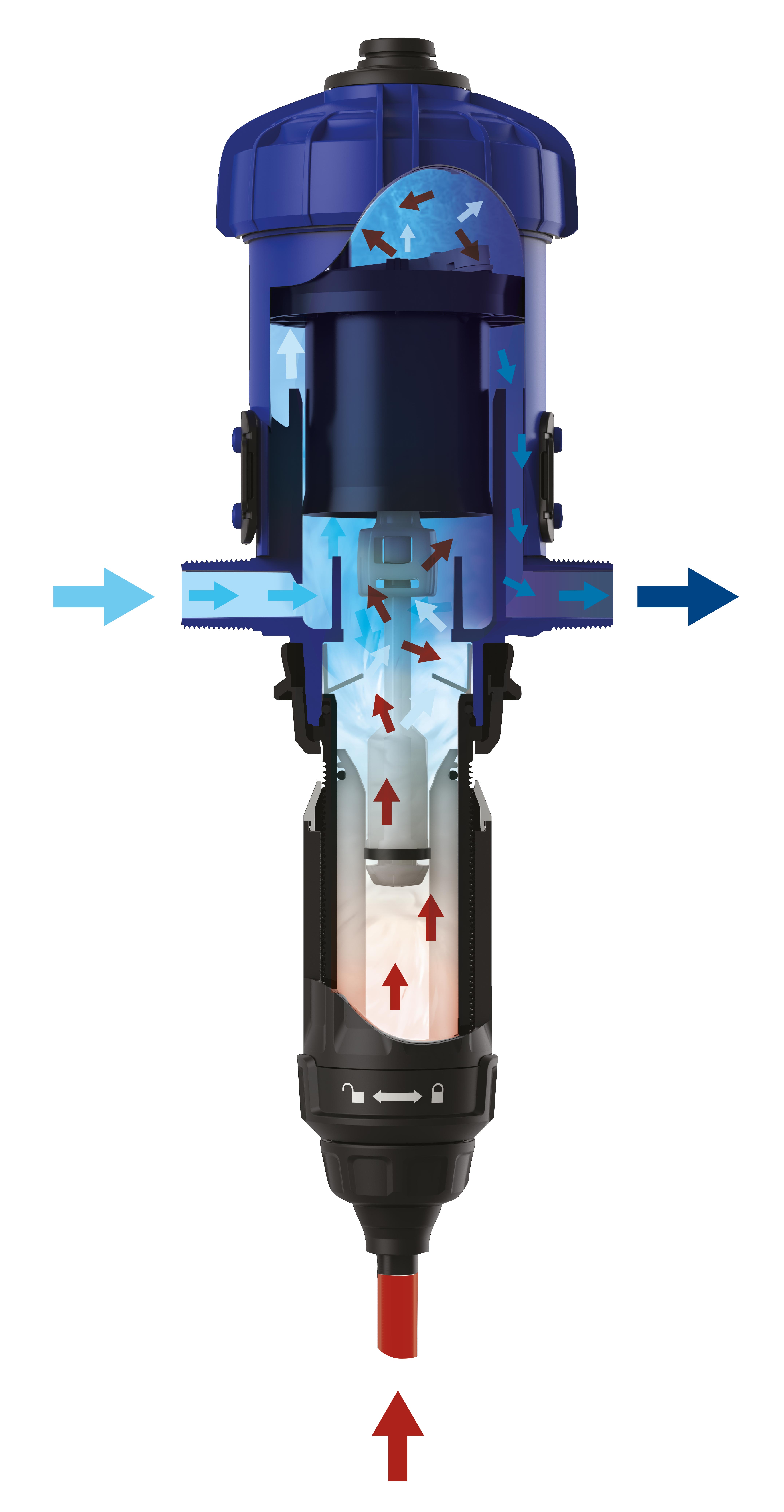 D25+care-serien er basert på Dosatrons ikke-elektriske, proporsjonale doseringsteknologi. Doseringspumpen er installert i et vannsystem og bruker vanntrykket og vannstrømmen som strømkilde.