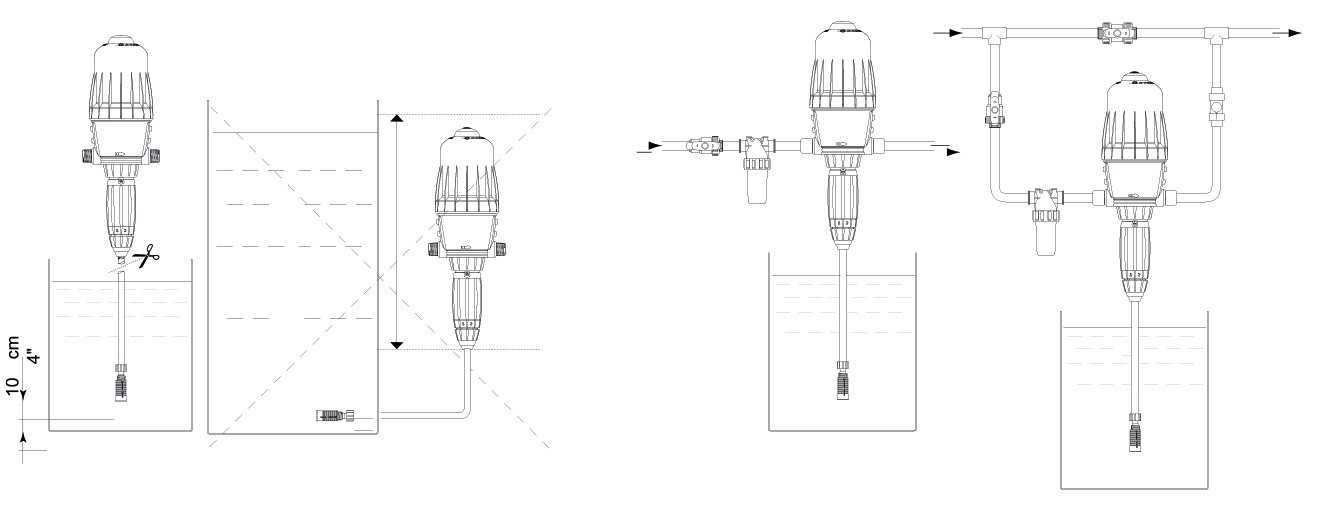 Dozaj pompası doğrudan ana su hattına veya bir by-pass'a bağlanabilir (her zaman su beslemesini sağlamak için önerilir).